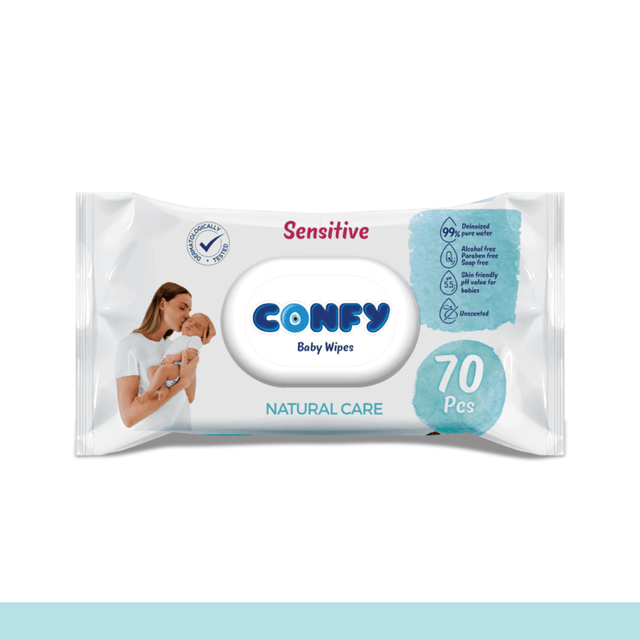 • Confy Sensitive Babydoekjes verpakking 1x70, met hypoallergene formule en pH 5.5 voor milde reiniging van de gevoelige huid.
