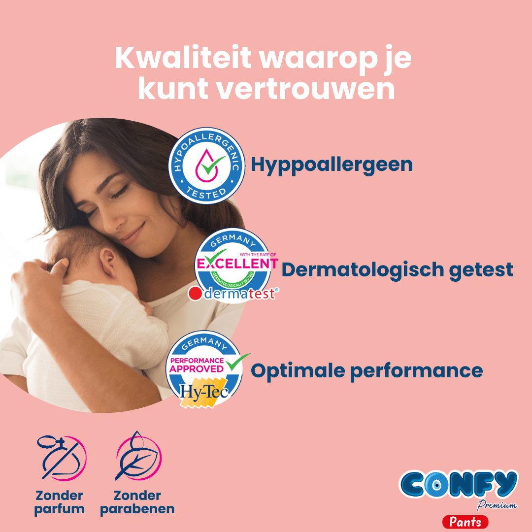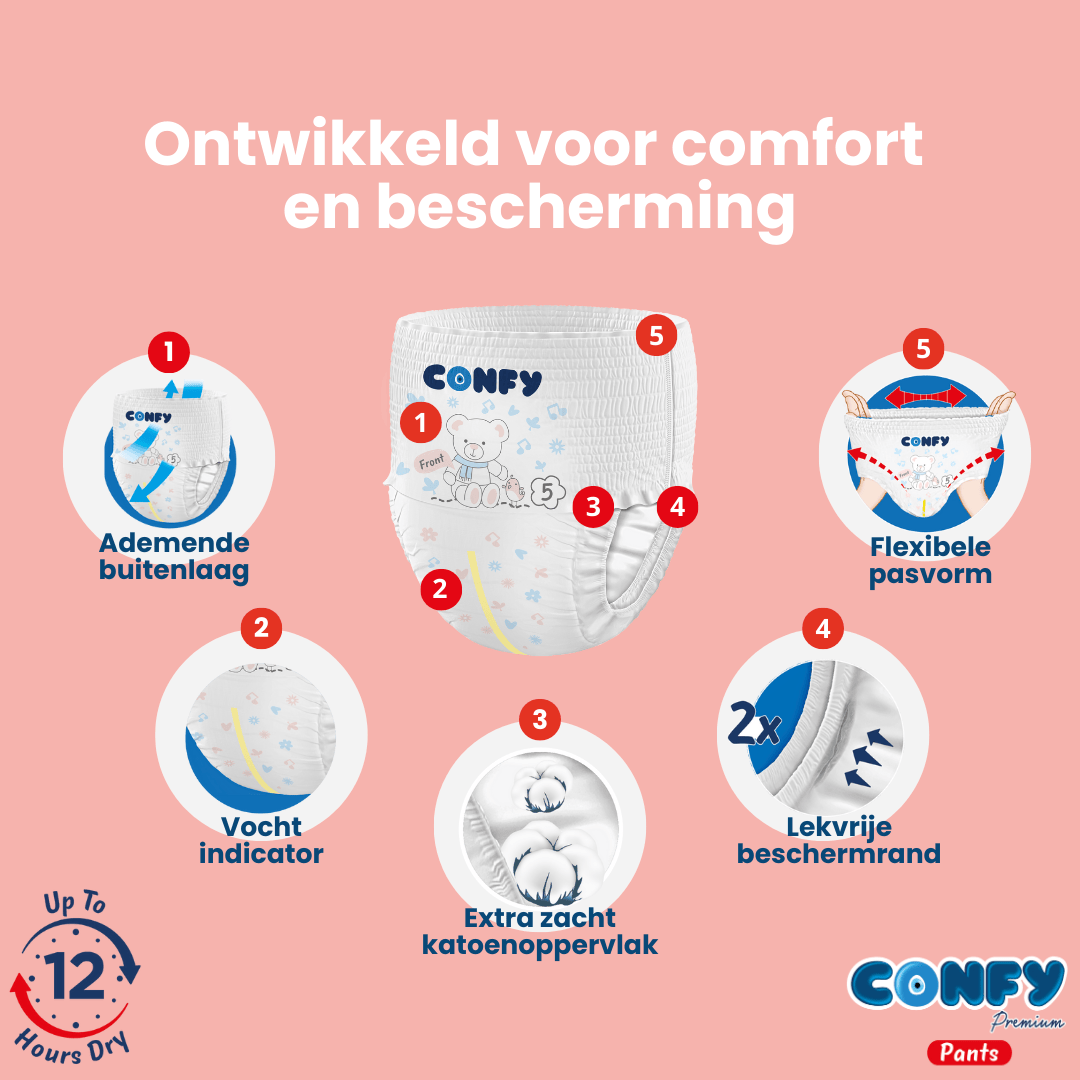 Confy Premium luierbroekjes bieden ouders wereldwijd de perfecte combinatie van gemak, comfort en bescherming. Verkrijgbaar in meer dan 60 landen en nu eindelijk in Nederland, combineren deze hypoallergene luierbroekjes ultieme bewegingsvrijheid met huidvriendelijkheid – en dat tot wel 30% goedkoper dan andere A-merken!