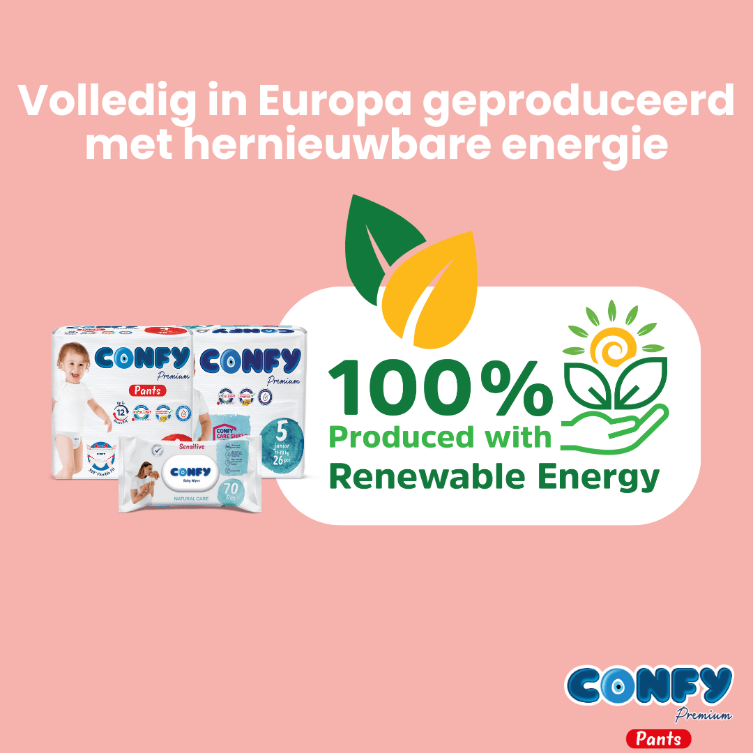 Alle Confy luierbroekjes zijn dermatologisch getest (Dermatest Excellent Rating) en voldoen aan strenge internationale normen. Het milieuvriendelijke productieproces en gebruik van hernieuwbare energie dragen bij aan een duurzamere toekomst.